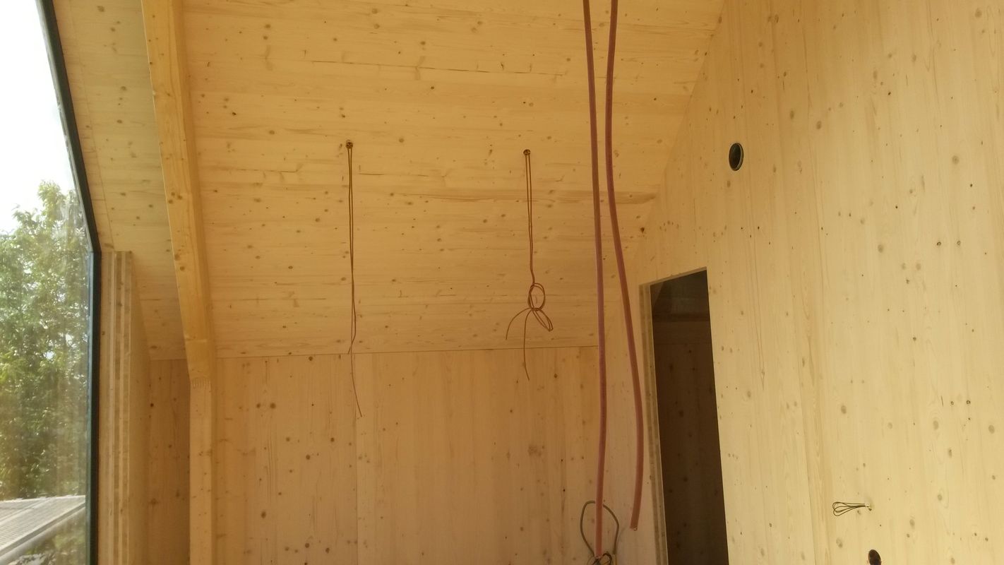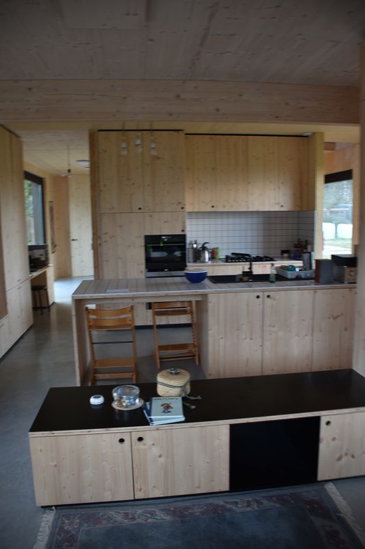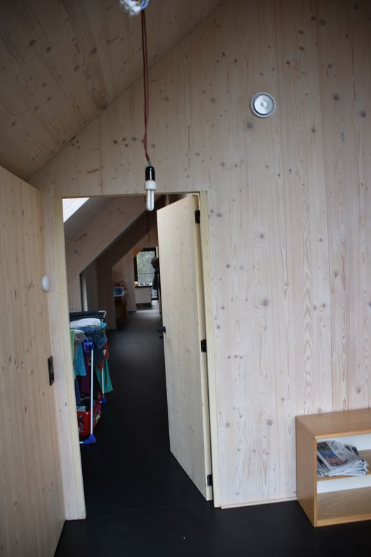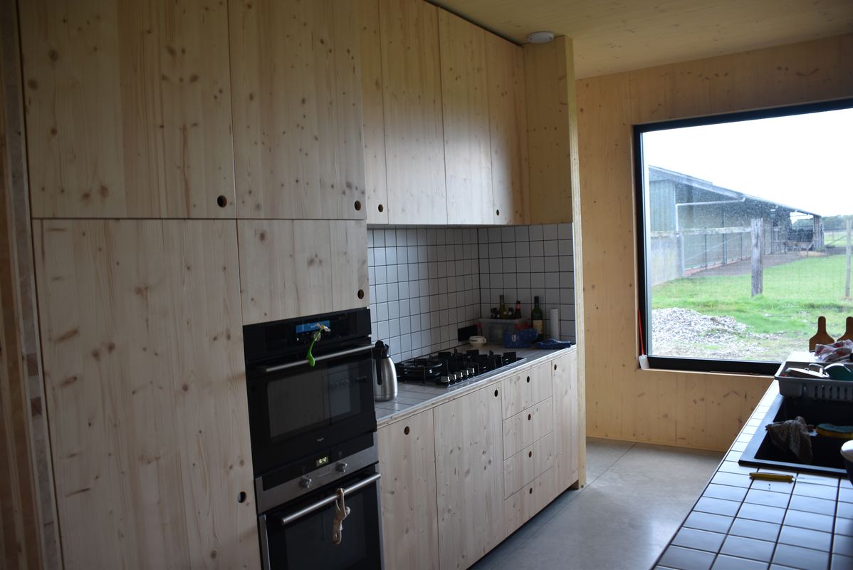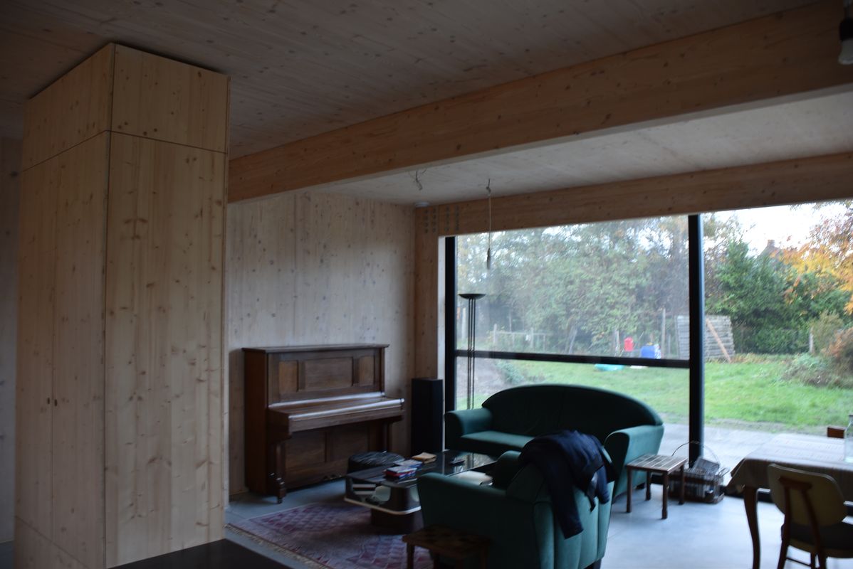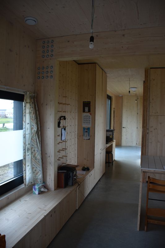 Een woning volledig uitgevoerd met houten elementen, wanden en vloeren.